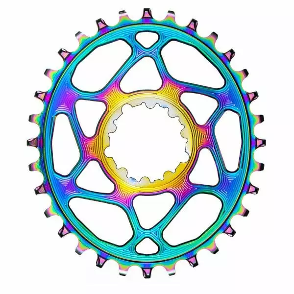 Le plateau est conçu en aluminium 7075, qui est un excellent compromis entre légèreté et robustesse. C’est un plateau Narrow-wide, c’est-à-dire qu’il fonctionne sans anti-dérailleur. De plus, sa denture particulière améliore le maintien de la chaine et réduit les frictions.
